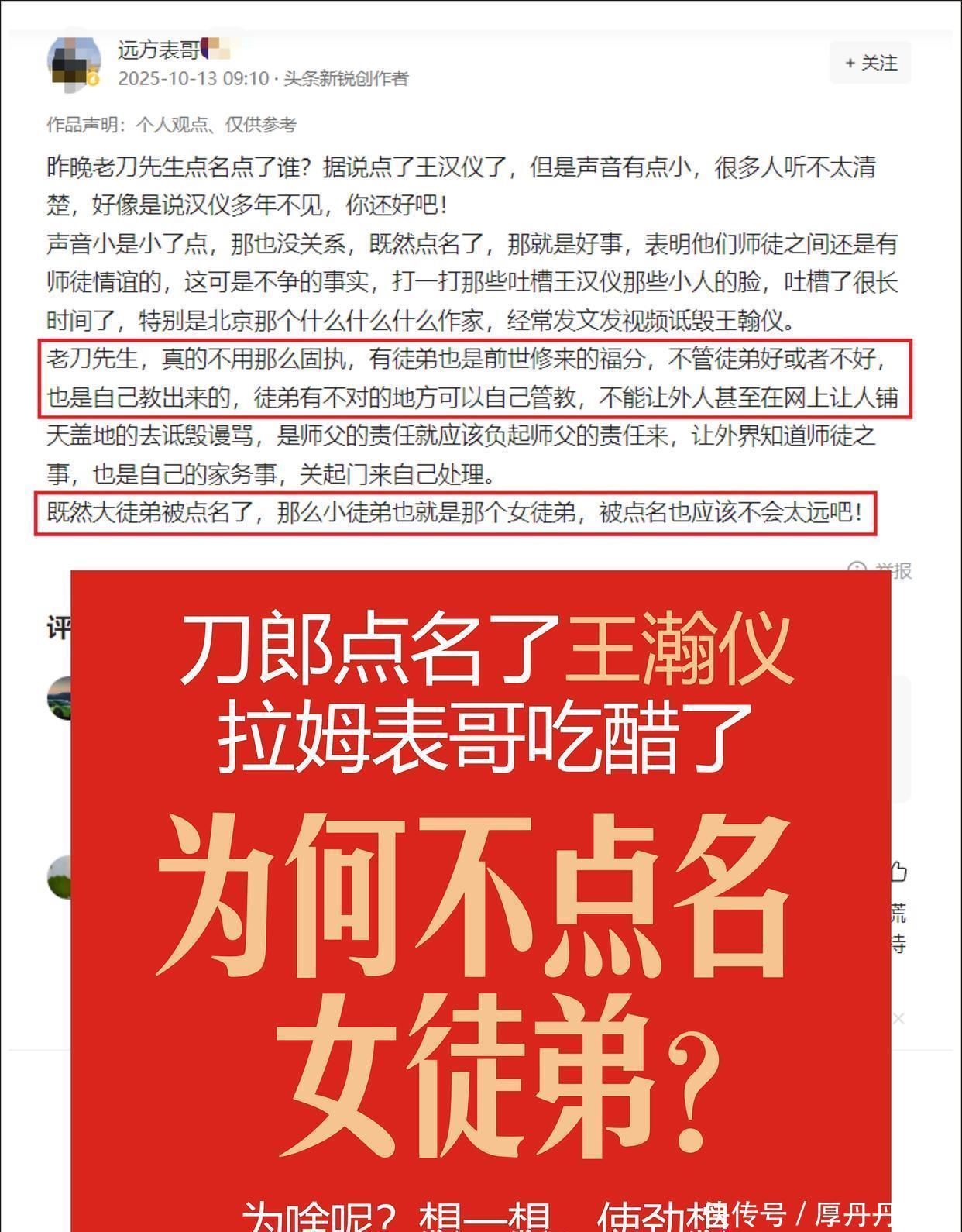 这无疑是对那些长期诋毁王瀚仪之人的有力回击,尤其是北京那位所谓的“作家”,常常发文发视频对王瀚仪进行恶意诋毁,而刀郎的这次点名,就像一记响亮的耳光,打在了这些小人的脸上。然而,就在众人沉浸在这份师徒情深的感动中时,拉姆的远房表哥却跳了出来,13号大清早就发文,酸溜溜地提及此事。他似乎对王瀚仪被点名一事心怀不满,言语间尽是醋意。表哥说,既然大徒弟都被点名了,那女徒弟是不是也快了?表哥喝多了,多睡会,梦里啥都有。